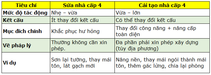 Bảng so sánh giữa Sửa chữa và Cải tạo nhà cấp 4
