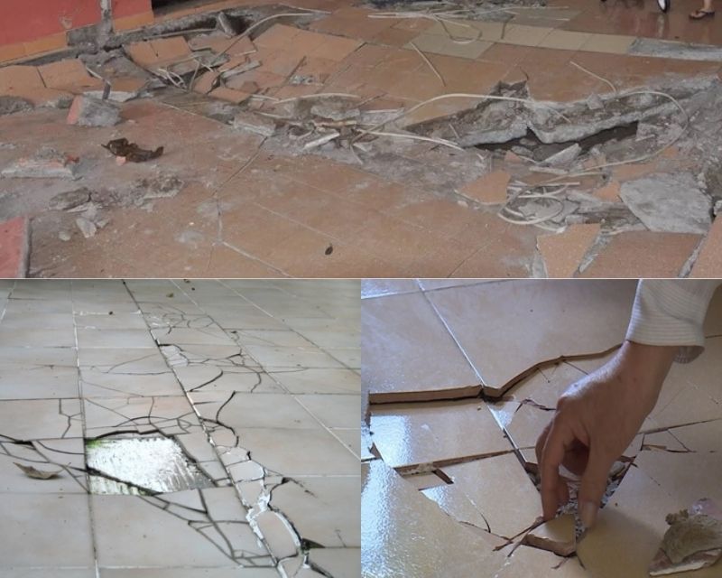 Nền nhà cấp 4 bị lún làm sàn nghiêng và gạch vỡ