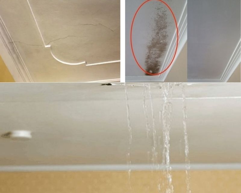 Mái bị rò rỉ, trần thạch cao ố vàng, võng – cần thay mới để đảm bảo an toàn và thẩm mỹ.